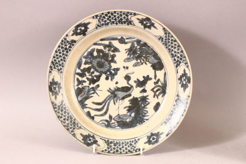 A PAIR OF CHINESE WANLI PERIOD BLUE & WHITE SHIPWRECK PORCELAIN PEACOCK DISHES.