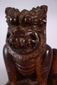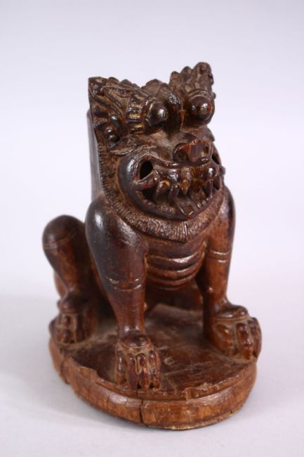 A 17TH CENTURY OR EARLIER SOUTH INDIAN CARVED WOODEN YALI FIGURE, 17cm high x 13cm wide.