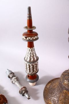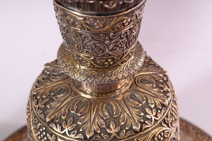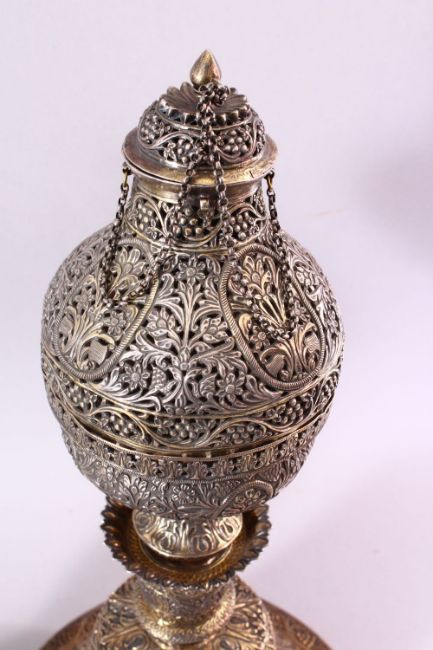 A FINE 19TH CENTURY INDIAN SILVER AND GILT HUQQA BASE, pierced with floral decoration, with two later abalone shell inlaid fittings and pipe, base 50cm high.