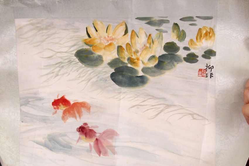 A GOOD 20TH CENTURY CHINESE SCROLL PAINTING, depicting a seated female figure, signed and with a red seal mark, 48cm x 36cm, together four other paintings of various subjects and sizes.