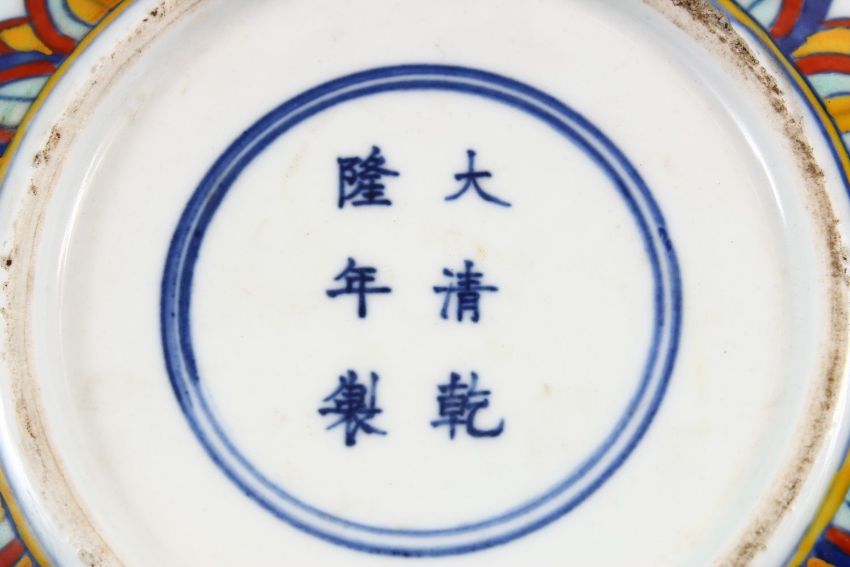 A CHINESE WUCAI DECORATED PORCELAIN JAR - decorated with bats amongst stylized clouds, with ruyi borders, the base with a six character mark, 7cm high x 22cm diameter.