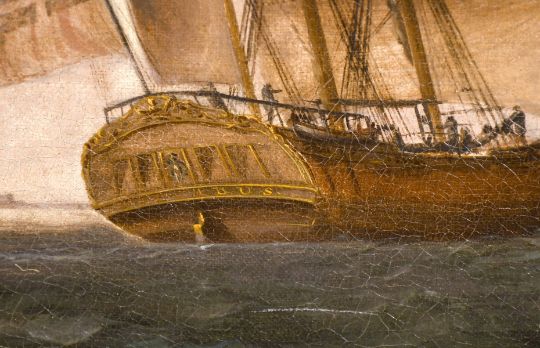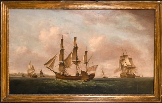 Attributed to Francis Holman (1729-1784) British, the Columbus in three positions off the coast with other shipping, oil on canvas, 26" x 48". Provenance: Christies 23/6/1978 lot 73. Purchased from Wilkins & Wilkins, London, in 1985.