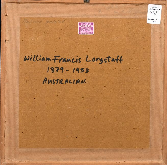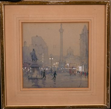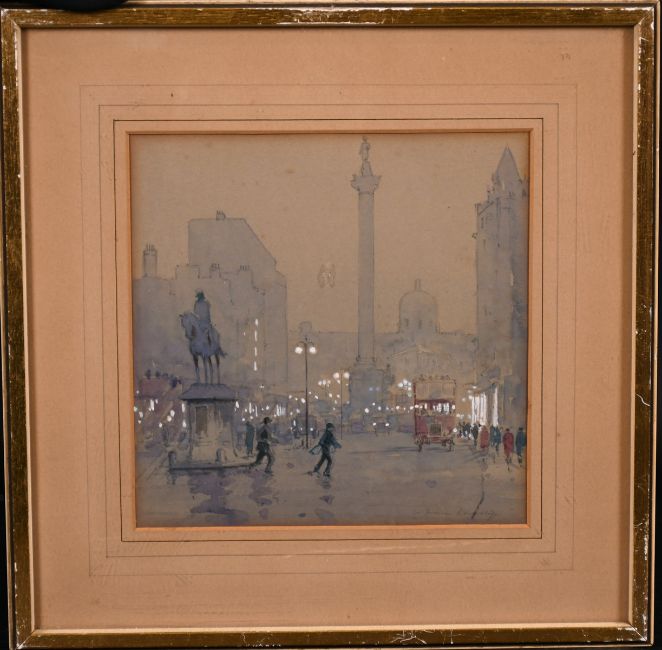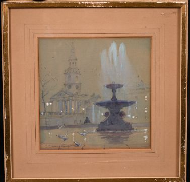 William Francis Longstaff (1879-1953) Australian, A set of five scenes of London landmarks, Trafalgar Square, Houses of Parliament, Westminster Abbey, Blackfriars Bridge, the fountain in Trafalgar square, watercolour, signed, each 6.5" x 6.5".