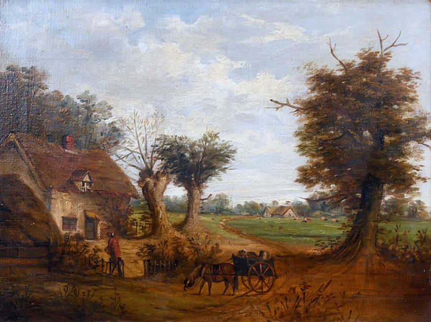 19th century British school, A landscape depicting a farm scene, oil on canvas, 12" x 16".