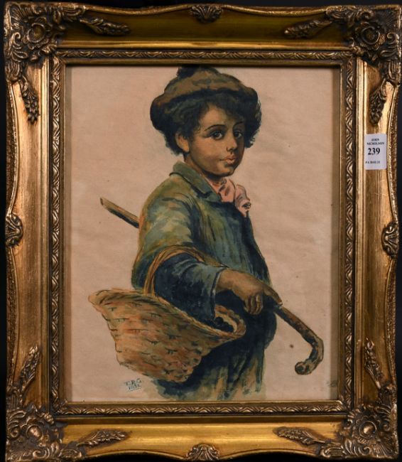 Italian school (Early 20th century), A child carrying a foraging basket and a cane, mixed media, initialled and dated 'T.G.R. 1933', 11.5" x 9.5".