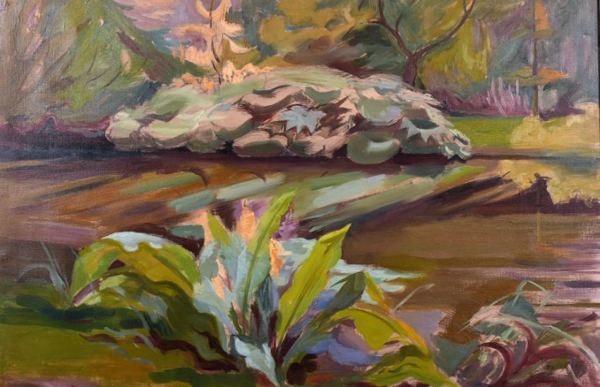 Phyllis Bray (1911-1991) British, A scene of a stream bordered by foliage, oil on canvas, signed with initials, 20" x 30".