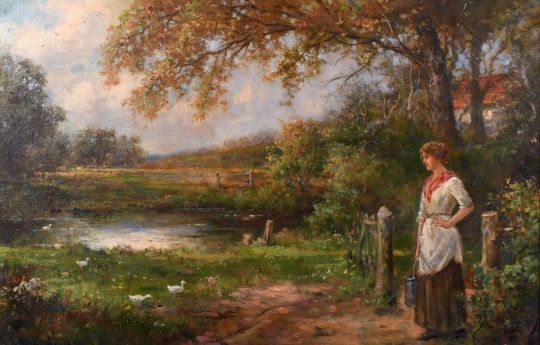 Stanley Leighton (1837-1901) British, A young lady with ducks by a river with fields beyond, oil on canvas, signed, 20" x 30".