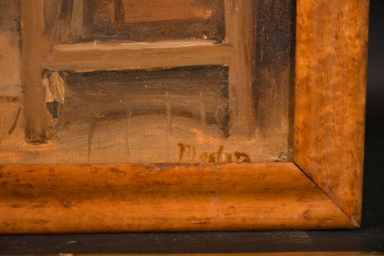 Mostyn (early 20th century) A scene of figures in a fishmonger's stall, oil on canvas, signed 18" x 14", in maple veneered frame.
