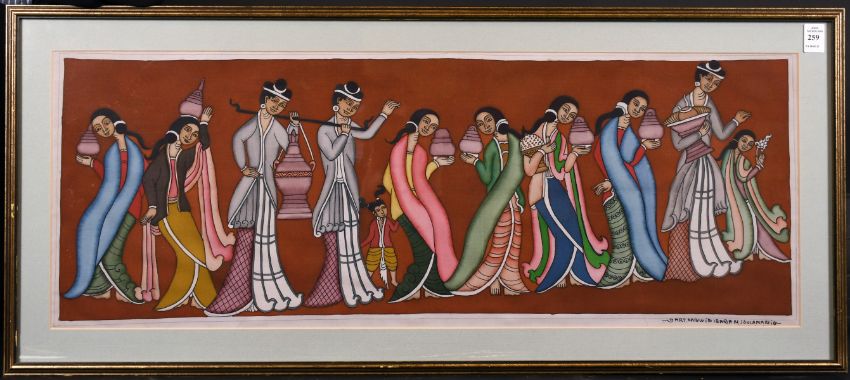 20th century Burmese school, A scene of female figures, watercolour on fabric, with inscription, 11.5" x 31".