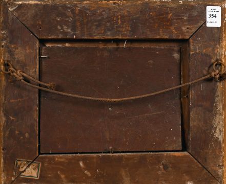 19th century English school, A scene of wayfarers at rest in a landscape, oil on mahogany panel, 6" x 8.25". (A/F).