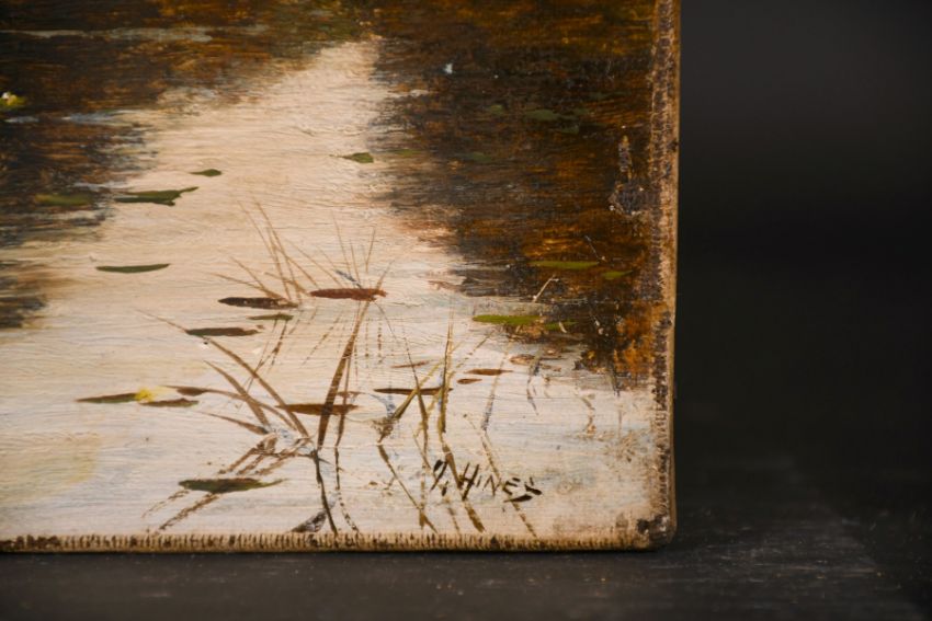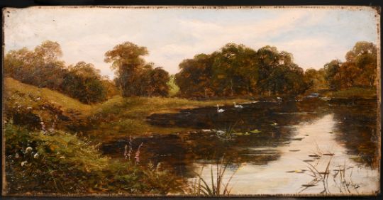 Theodore Hines (19th century) British, Swans on a lake with wildflowers in the foreground, oil on canvas, signed, 8" x 16", (Unframed).
