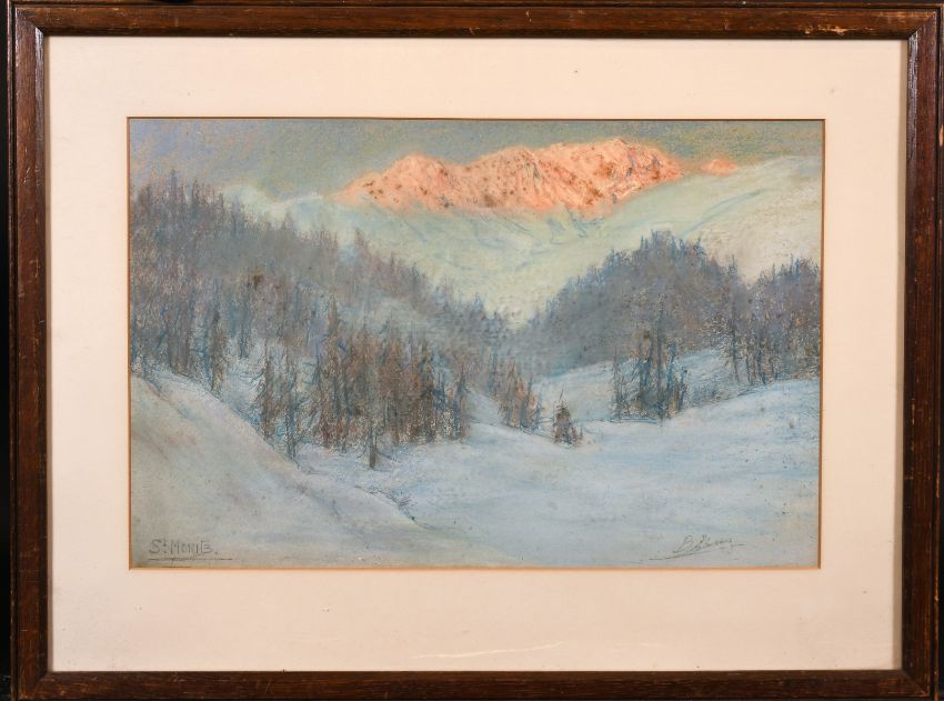 B. Johnson (early 20th century), 'St. Moritz', A view of a snowy valley with sunlit peaks, pastel, signed and inscribed. 11" x 17".