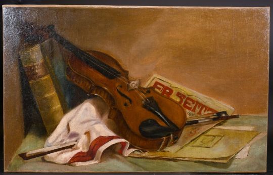Early 20th century school, a still life study of a violin and sheet music, oil on canvas, 17" x 26.5", (unframed).
