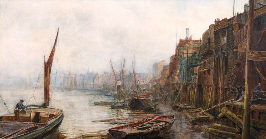 Thomas M. Hemy (1852-1937) British, 'Limehouse Hole', Moored boats on a working quay, watercolour, signed, 20"x 36".