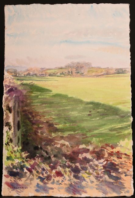 Howard J. Morgan (b. 1949), Country landscape with fields in shadow, watercolour, signed and with artist's studio stamp verso, unframed. 22.5" x 15".