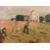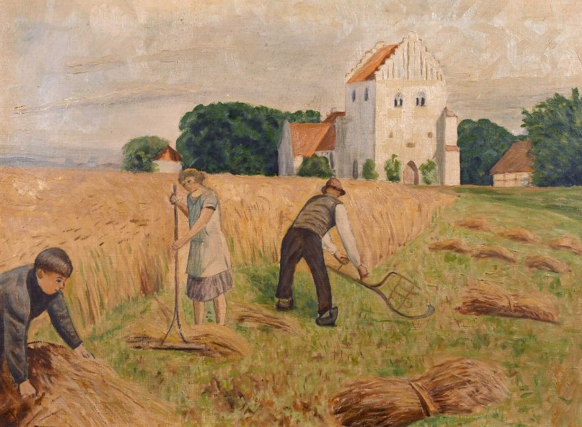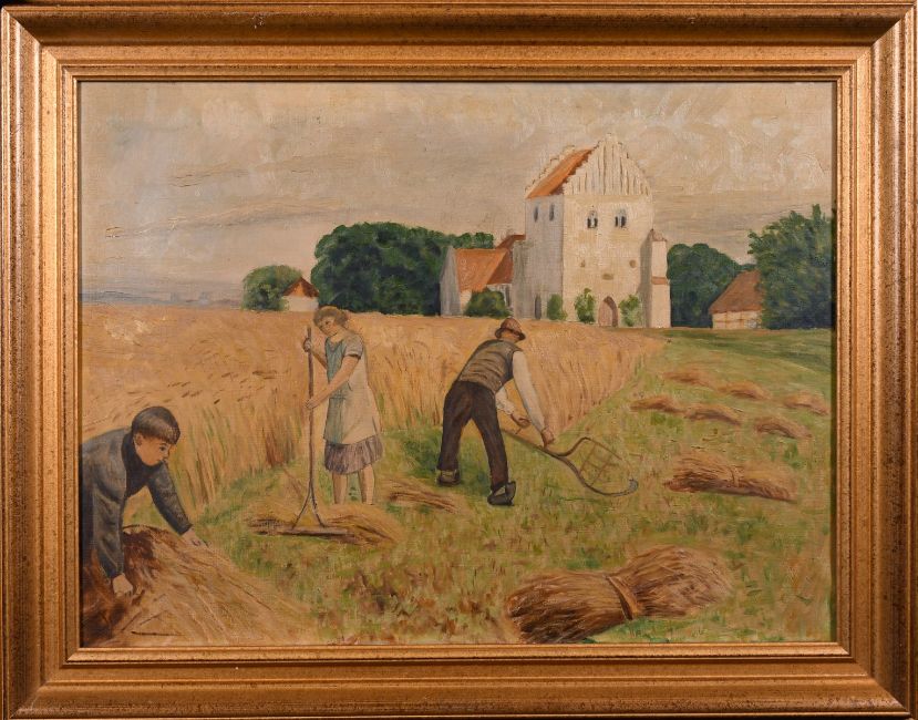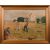 Early 20th century school, figures harvesting near barns, oil on canvas, 18" x 24".