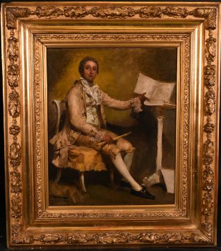 Early 20th century continental school, A study of a finely dressed flautist in a lavish interior, oil on canvas, indistinctly signed and dated 1918, 17" x 15".