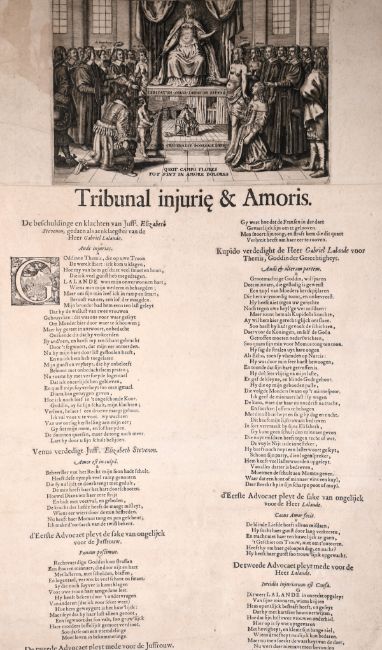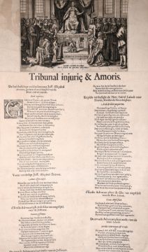 Crispin Van de Passe II, 17th century old master engraving, 'Tribunal Injurie and Amoris', Elizabeth Stevenon and Gabriel Lalande, incorporated into a broadside with some loss at the lower edge, 20" x 11.5", (unframed).
