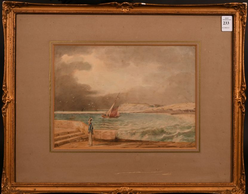19th century French school, a coastal scene with a soldier walking along the promenade with boat and figures beyond, watercolour, 8" x 11".
