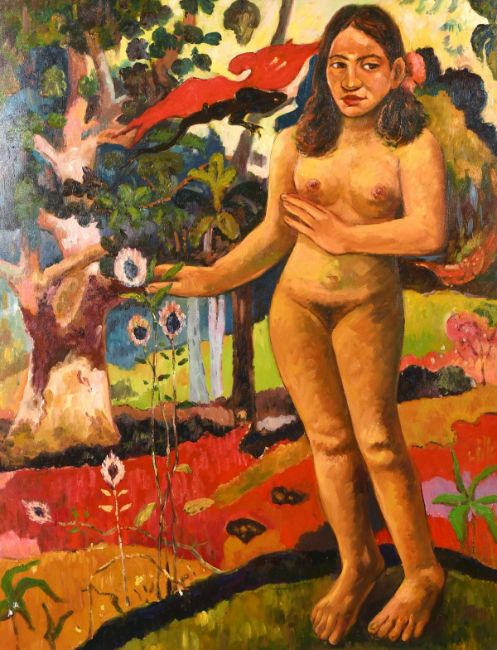After Gauguin, A female nude in a colourful landscape, oil on canvas, 30" x 24".