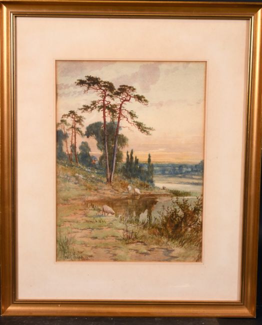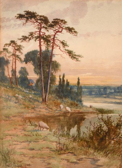 Frank Hider (1861-1933) British, Sheep watering at dusk, watercolour, signed and dated '1904', 15" x 10.5".