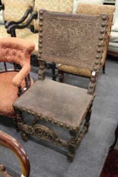 An 18th century oak framed armchair with embossed leather and brass back and seat.
