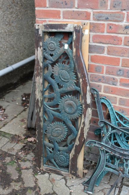 Three pairs of cast metal bench ends together with a seat and a back from one bench.