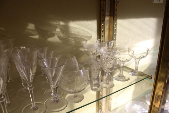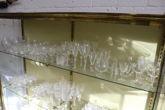 A shelf of cut glass and other drinking glasses.