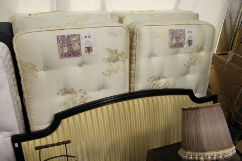 A king size bed with a pair of Staples Mozart mattresses on box bases together with a striped upholstered headboard.