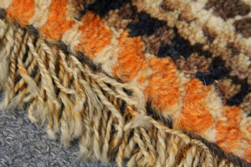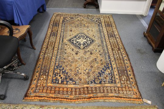 A Persian Shiraz rug, beige ground with stylized decoration.