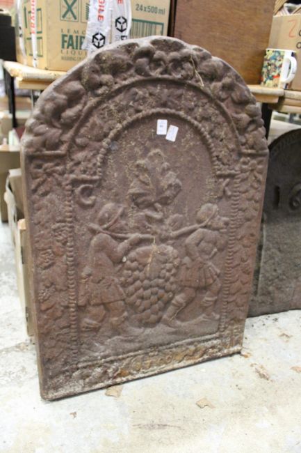 A large cast iron fire back depicting grape harvesting.