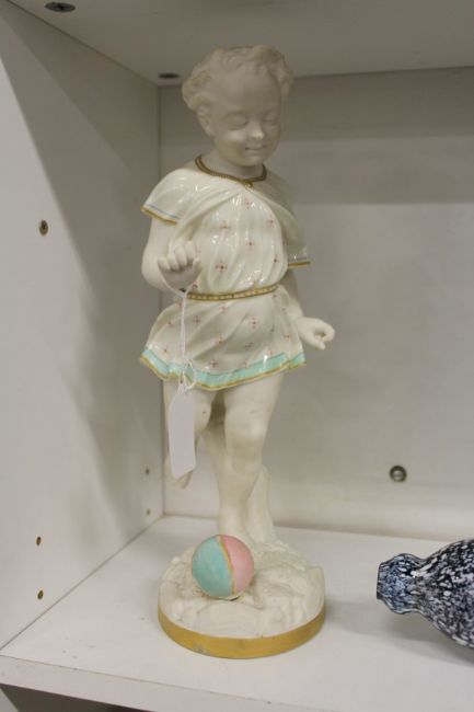 A unusual Royal Worcester part glazed figure of a young girl about to kick a ball.