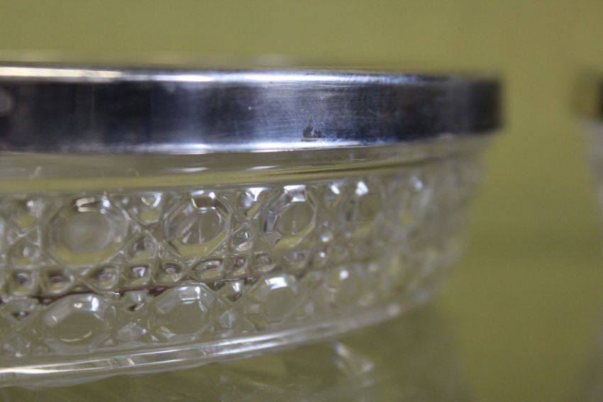 A pair of moulded glass hors d'oeuvres dishes with plated rims.