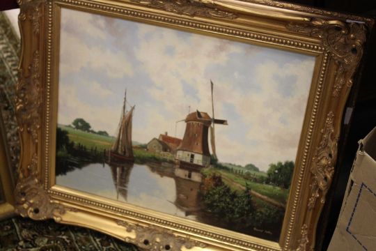A River Scene with Windmill oil on canvas and another similar.