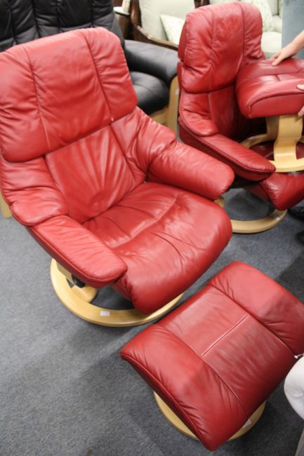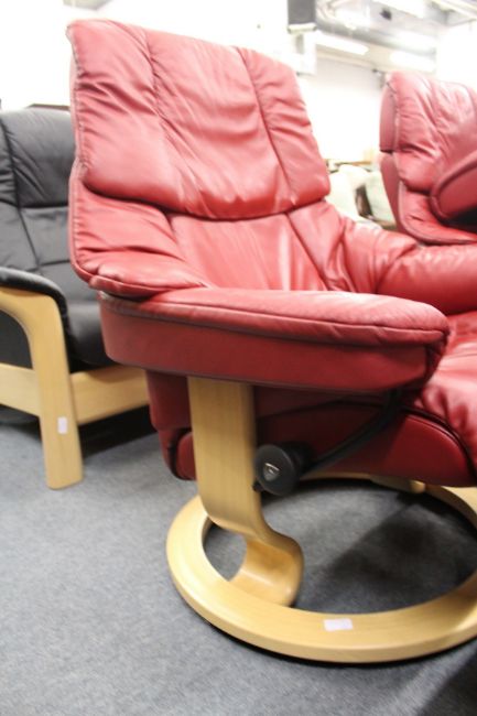 A good Stressless red leather upholstered swivel armchair with matching foot stool.