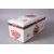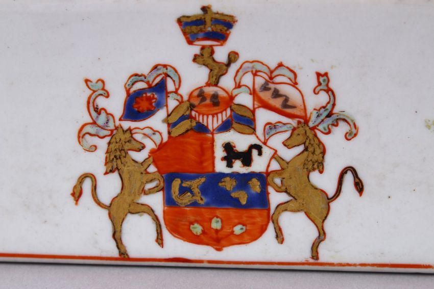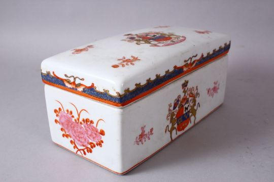 A 19TH / 20TH CENTURY CHINESE FAMILLE ROSE ARMOURIAL PORCELAIN BOX & COVER, the box with a armorial crest and floral highlights with bands of raised decoration, 21cm wide x 11cm deep x 9cm high.