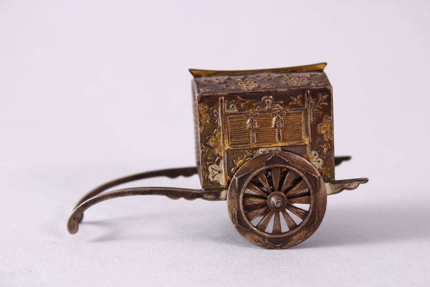 A 19TH CENTURY JAPANESE GILT SILVER SALT SHAKER in the form of a rickshaw, with moulded decoration and moving wheels, base marked 'sterling Japan', 6.5cm.