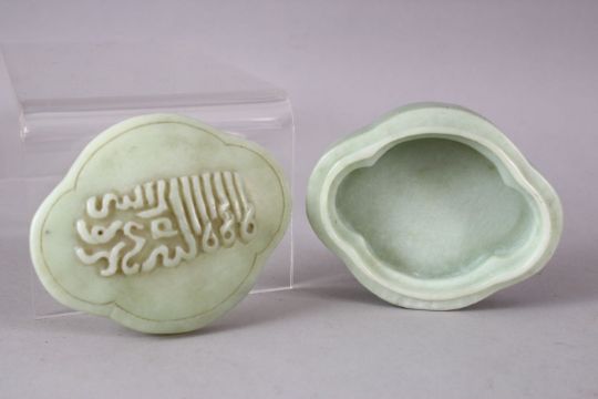 A RARE 19TH CENTURY CHINESE CARVED JADE BOX AND COVER for the Islamic market, of lobed form, the lid carved with calligraphy, 9cm long