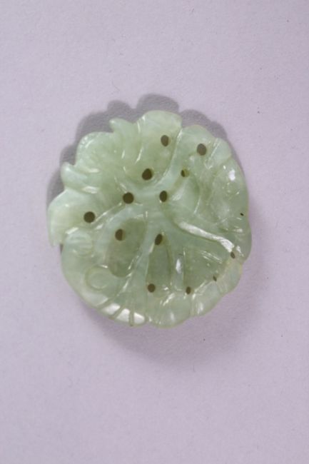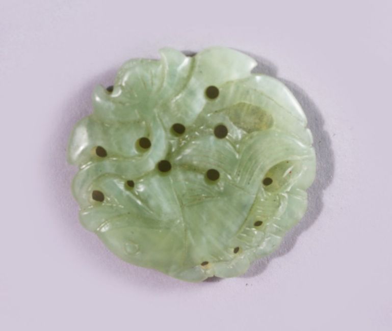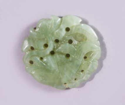 A 19TH CENTURY CHINESE PIERCED AND CARVED JADE ROUNDEL, with carved fish, 5cm.