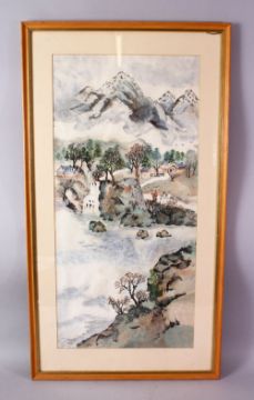 A CHINESE FRAMED PAINTING OF A NATIVE LANDSCAPE SCENE, depicting a native waterside landscape scenes with mountains, 83cm x 46cm.