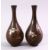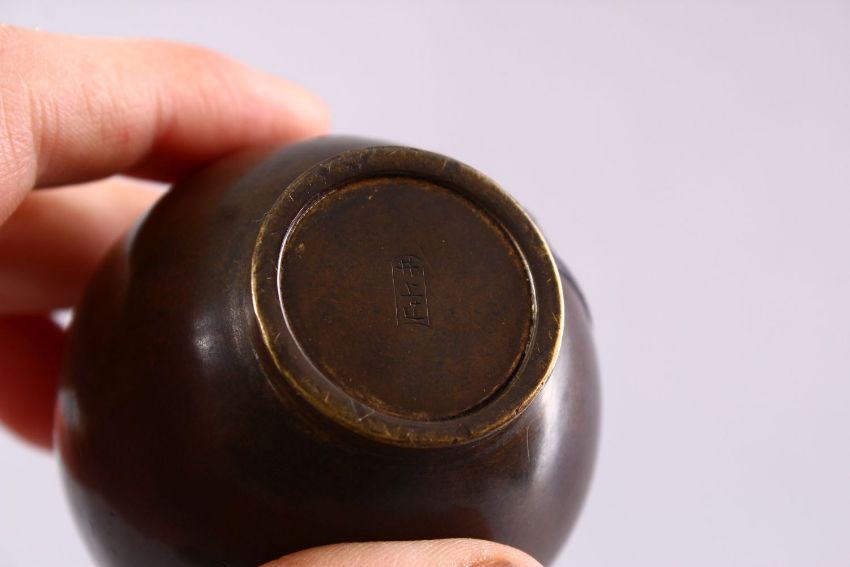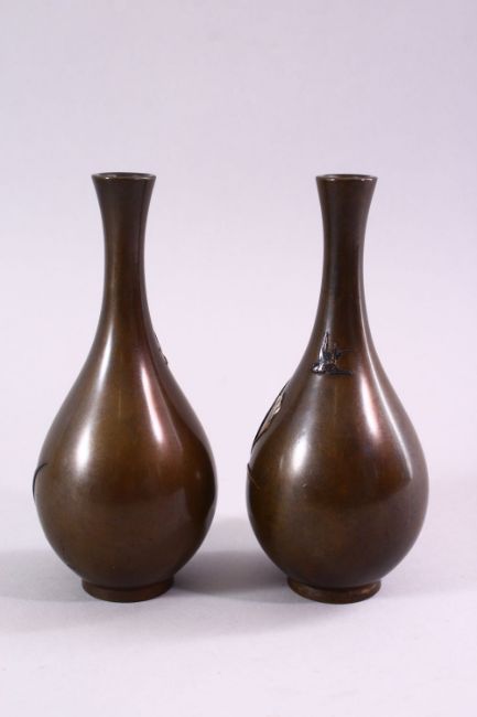 A FINE PAIR OF JAPANESE MEIJI PERIOD BRONZE & MIXED METAL SIGNED VASES, the pair of vases decorated in mixed metal with a simple display of iris beneath birds in flight, the bases each artist signed. 14cm high.