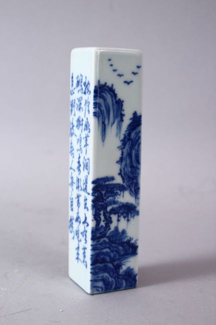 A CHINESE BLUE & WHITE PORCELAIN SCHOLARS WAX SEAL, the body decorated with landscape views and calligraphy, the underside with characters, 12cm high.