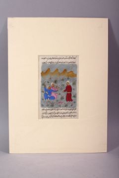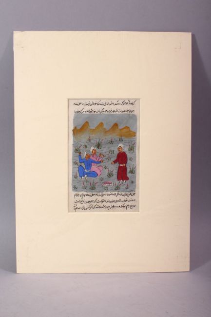 AN INDIAN HAND PAINTED MANUSCRIPT PAGE, depicting three figures in a landscape scene, image size 17cm x 11cm.