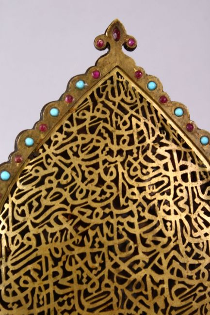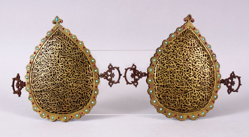 A PAIR OF 19TH CENTURY ISLAMIC GILT METAL OPENWORK CALLIGRAPHIC PANELS, inlaid with turquoise and ruby like stones, with open work calligraphy, 14.5cm x 16.5cm.