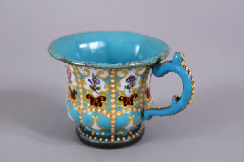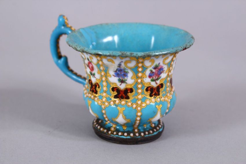 A FINE 19TH CENTURY OTTOMAN OR OTTOMAN MARKET ENAMELLED CUP AND SAUCER, with finely painted panels of flora and gilding, 6cm x 7.5cm.