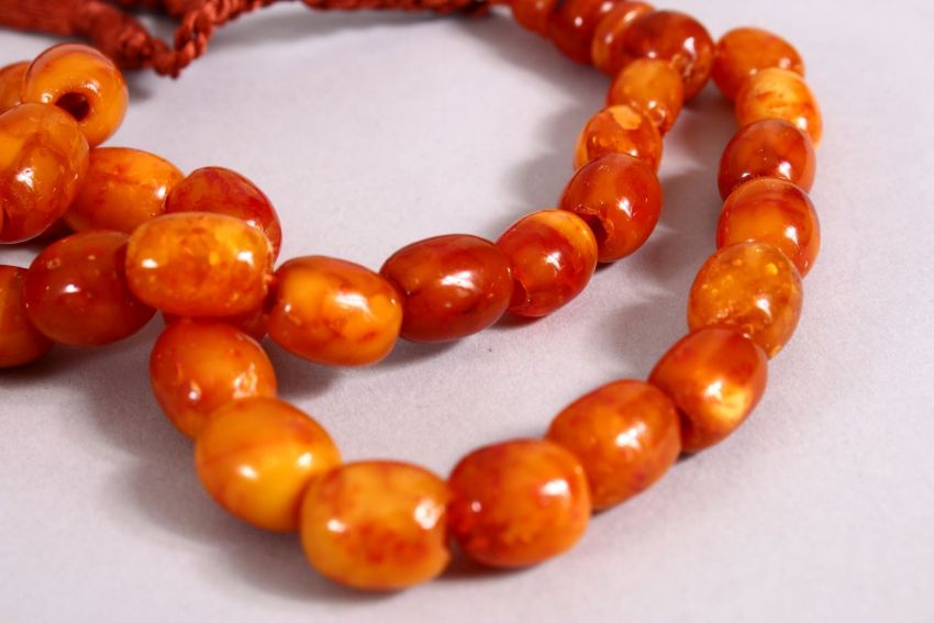 A 19TH CENTURY ISLAMIC CARVED AMBER PRAYER BEAD NECKLACE, with 46 carved beads, and three spacers, approx. 65cm open.