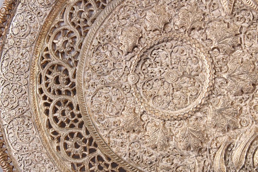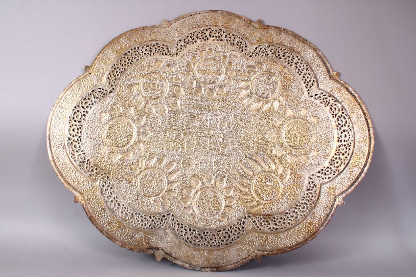 A LARGE AND HEAVY 19TH CENTURY INDIAN SILVERED METAL RELIEF TRAY - FISH , decorated with raised native necklace decoration unusually with fish, upon a native floral carved ground, with a pierced outer border, 72cm x 52.5cm.