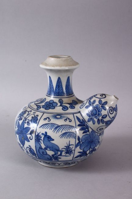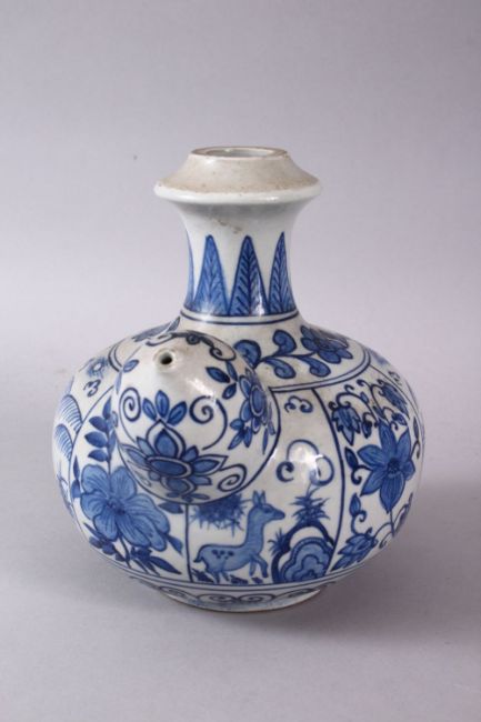 A CHINESE BLUE & WHITE PORCELAIN POURING VESSEL - FOR THE ISLAMIC MARKET, decorated with panles of deer and flora, 17cm x 16cm.