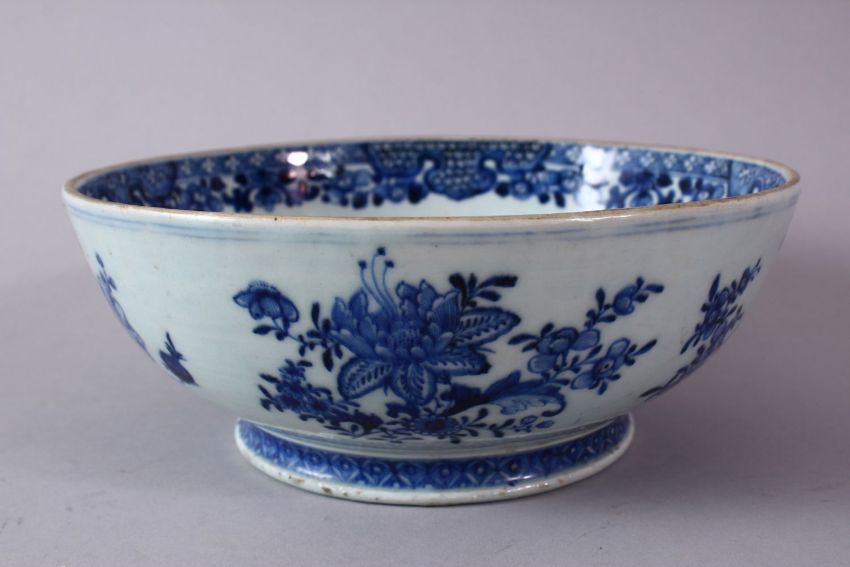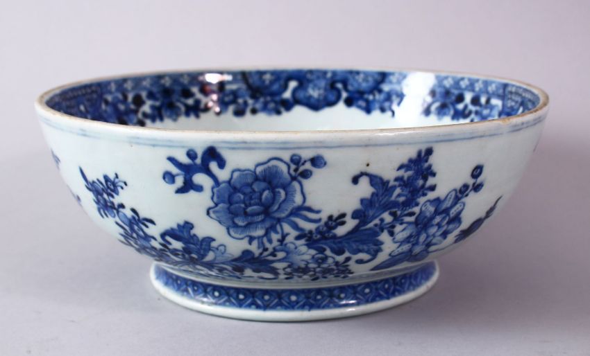 A 18TH/19H CENTURY CHINESE POSSIBLE QIANLONG BLUE AND WHITE PORCELAIN BOWL, with native floral decoration and interior band, the base bottomless, 22cm diameter.