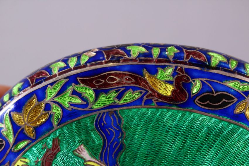 A FINE INDIAN ENAMELLED SILVER PERFUME FLASK, decorated to each side with a panel depicting a courting couple, 14cm high.